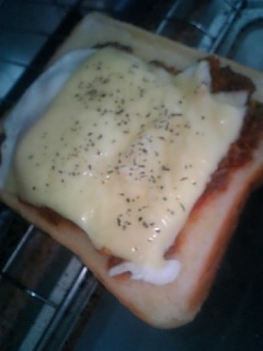 なんか一晩置いたら美味くなってたのでトーストにする。 パンにミートソースを敷いて、半熟目玉焼きを載せて、チーズを被せて、粗引き胡椒とバジルを振りかけ~ トースターに閉じ込めて熱々になっていただく。